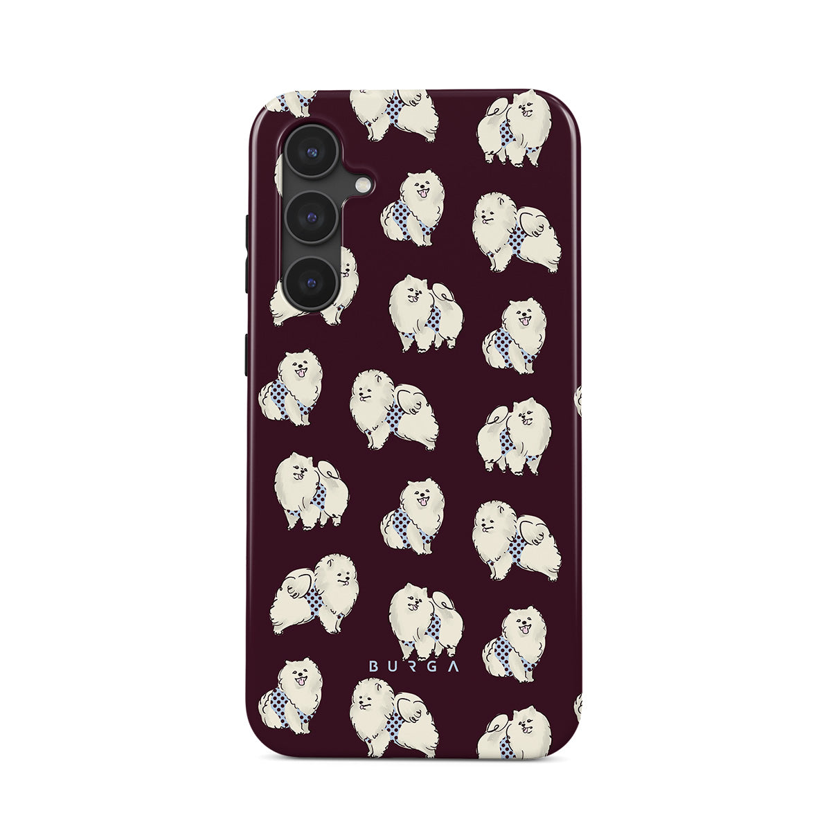 このデザインの特徴:深いバーガンディ色の背景に白くてふわふわの犬(プードル)が描かれており、ペット好きにぴったりです。