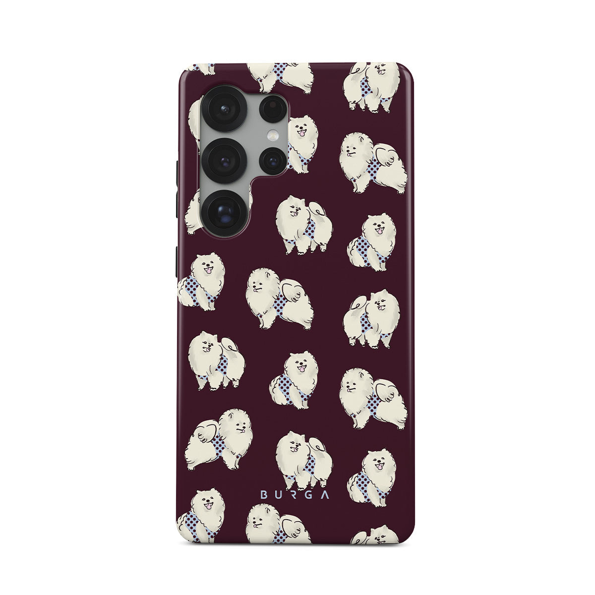 このデザインの特徴:深いバーガンディ色の背景に白くてふわふわの犬(プードル)が描かれており、ペット好きにぴったりです。