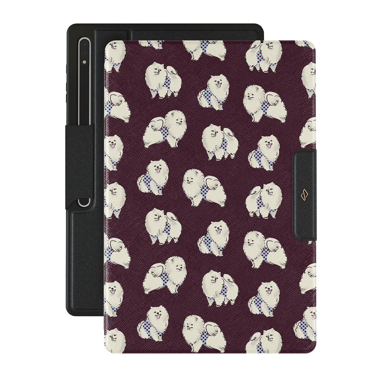 このデザインの特徴:深いバーガンディ色の背景に白くてふわふわの犬(プードル)が描かれており、ペット好きにぴったりです。