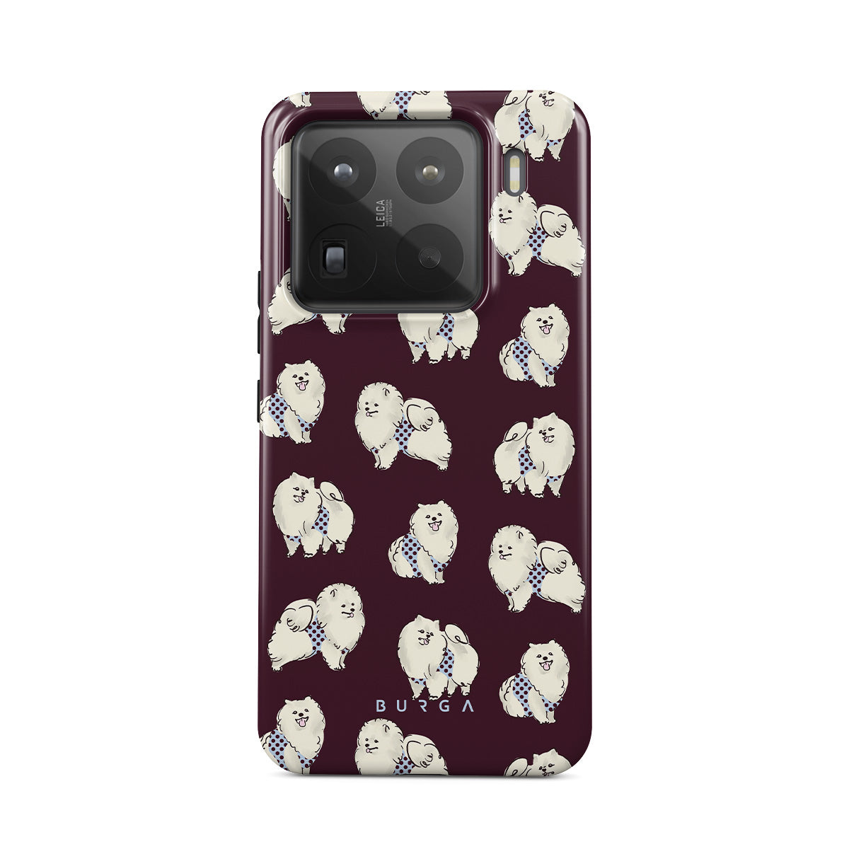 このデザインの特徴:深いバーガンディ色の背景に白くてふわふわの犬(プードル)が描かれており、ペット好きにぴったりです。