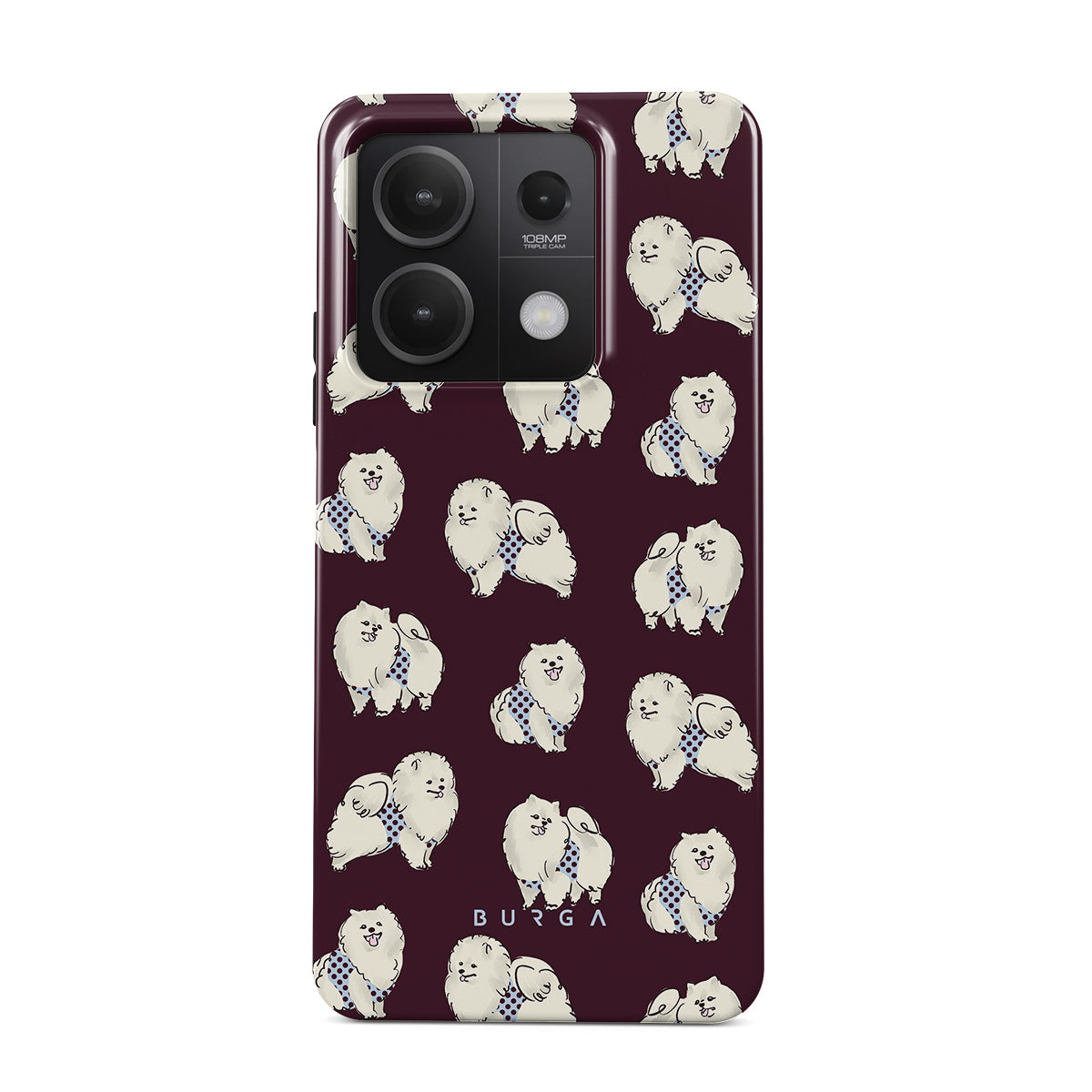 このデザインの特徴:深いバーガンディ色の背景に白くてふわふわの犬(プードル)が描かれており、ペット好きにぴったりです。
