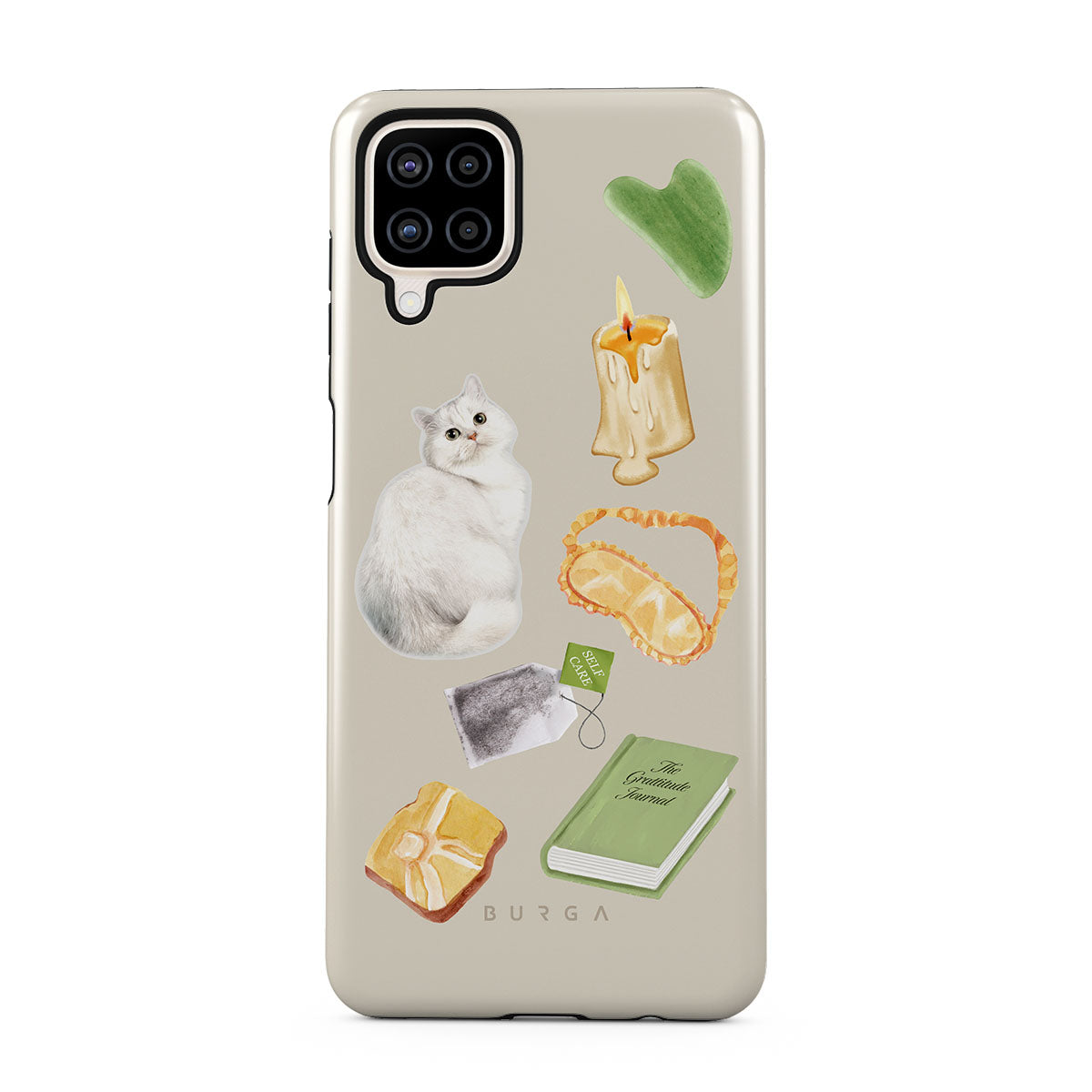 このデザインの特徴:、白い猫、緑の本、キャンドル、グアシャバー、アイマスク、ティーバッグ、黄色のクリスタルが含まれています。