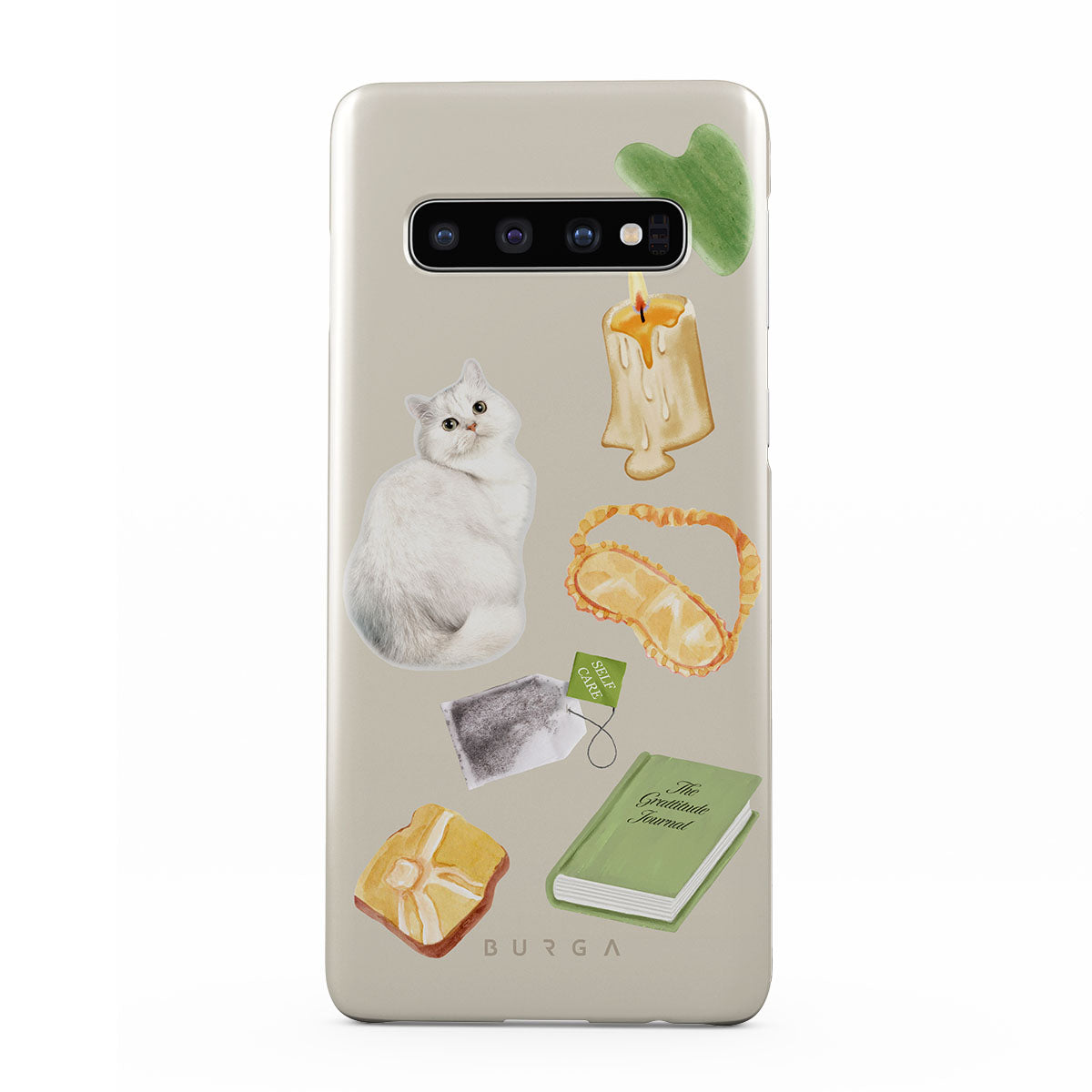 このデザインの特徴:、白い猫、緑の本、キャンドル、グアシャバー、アイマスク、ティーバッグ、黄色のクリスタルが含まれています。