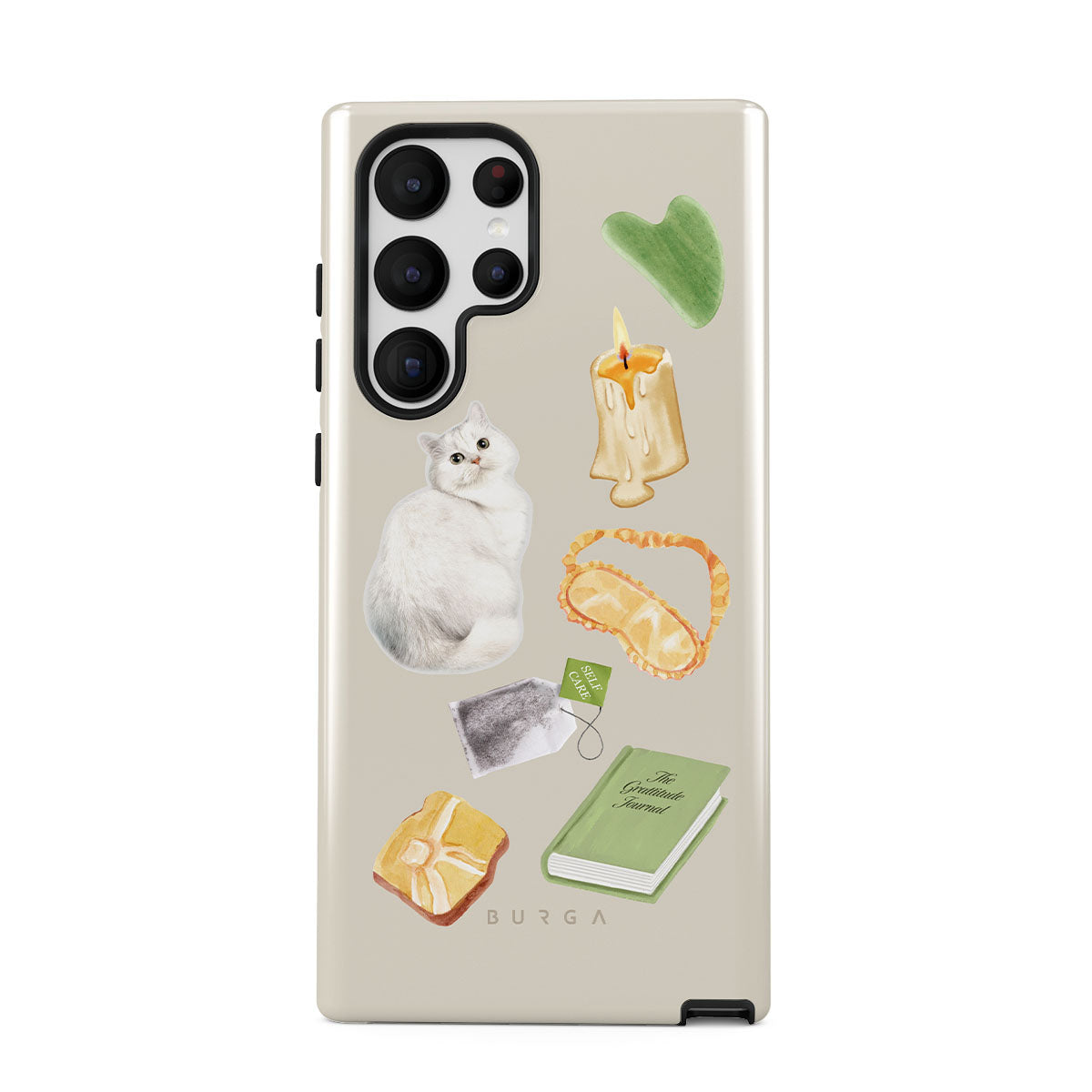 このデザインの特徴:、白い猫、緑の本、キャンドル、グアシャバー、アイマスク、ティーバッグ、黄色のクリスタルが含まれています。