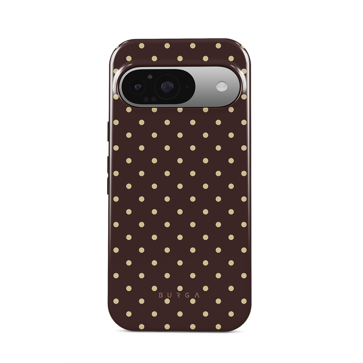 このデザインの特徴:茶色の背景、ベージュの水玉模様