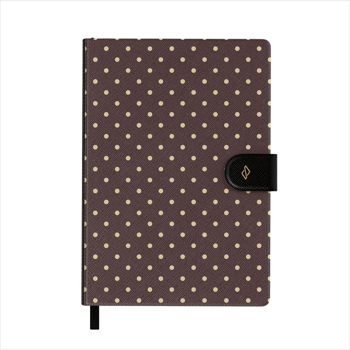 このデザインの特徴:茶色の背景、ベージュの水玉模様