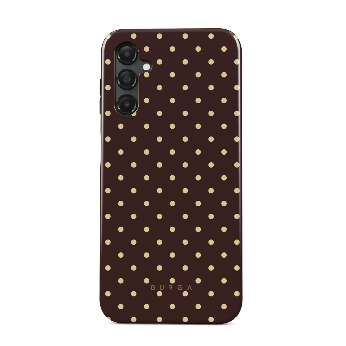 このデザインの特徴:茶色の背景、ベージュの水玉模様