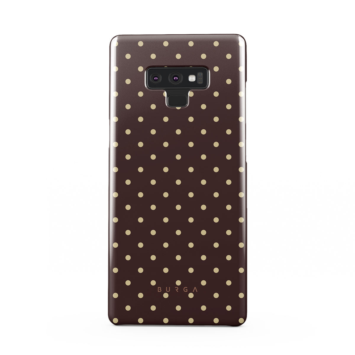 このデザインの特徴:茶色の背景、ベージュの水玉模様