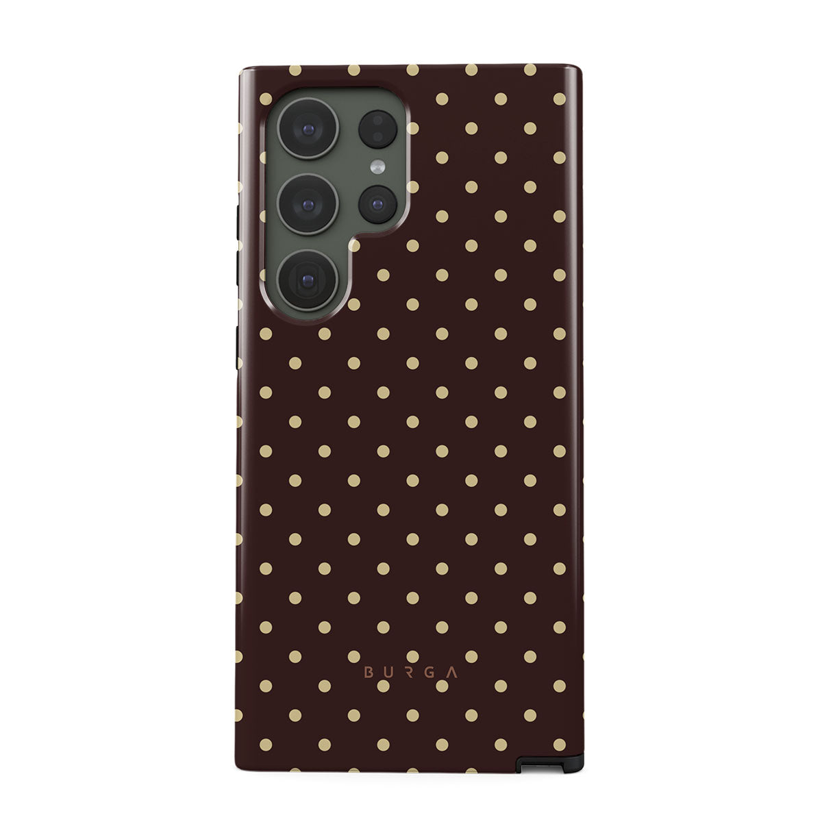 このデザインの特徴:茶色の背景、ベージュの水玉模様