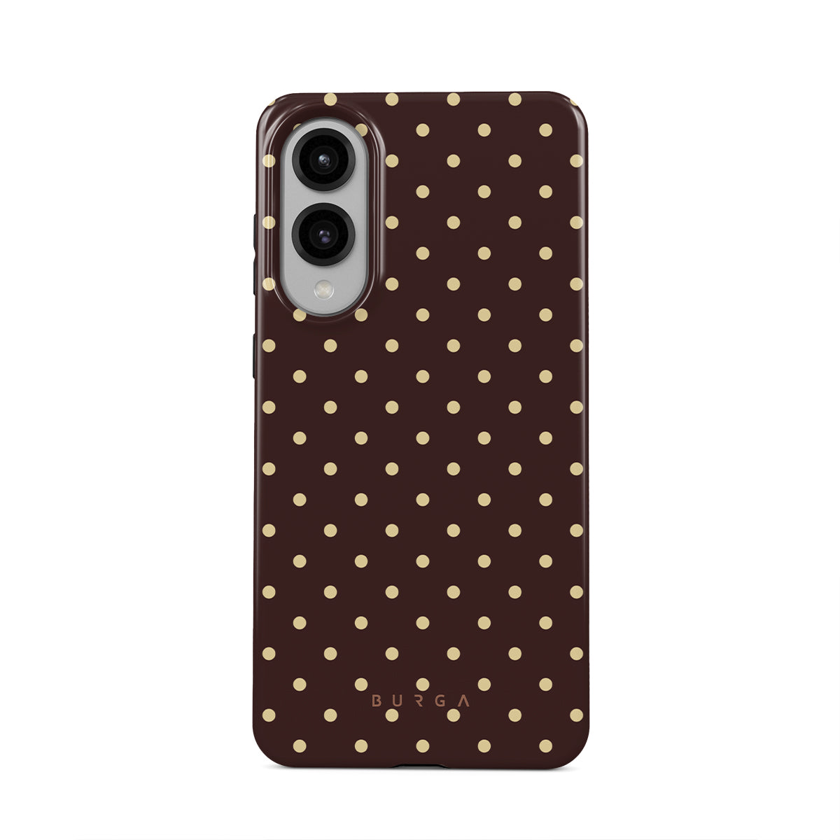 このデザインの特徴:茶色の背景、ベージュの水玉模様