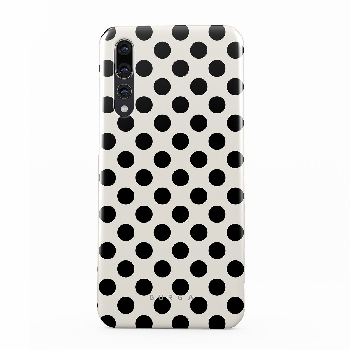 このデザインの特徴:白い背景に黒い水玉模様が施されています。