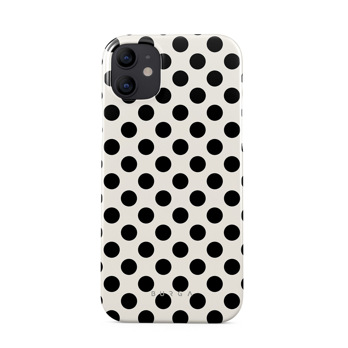 このデザインの特徴:白い背景に黒い水玉模様が施されています。