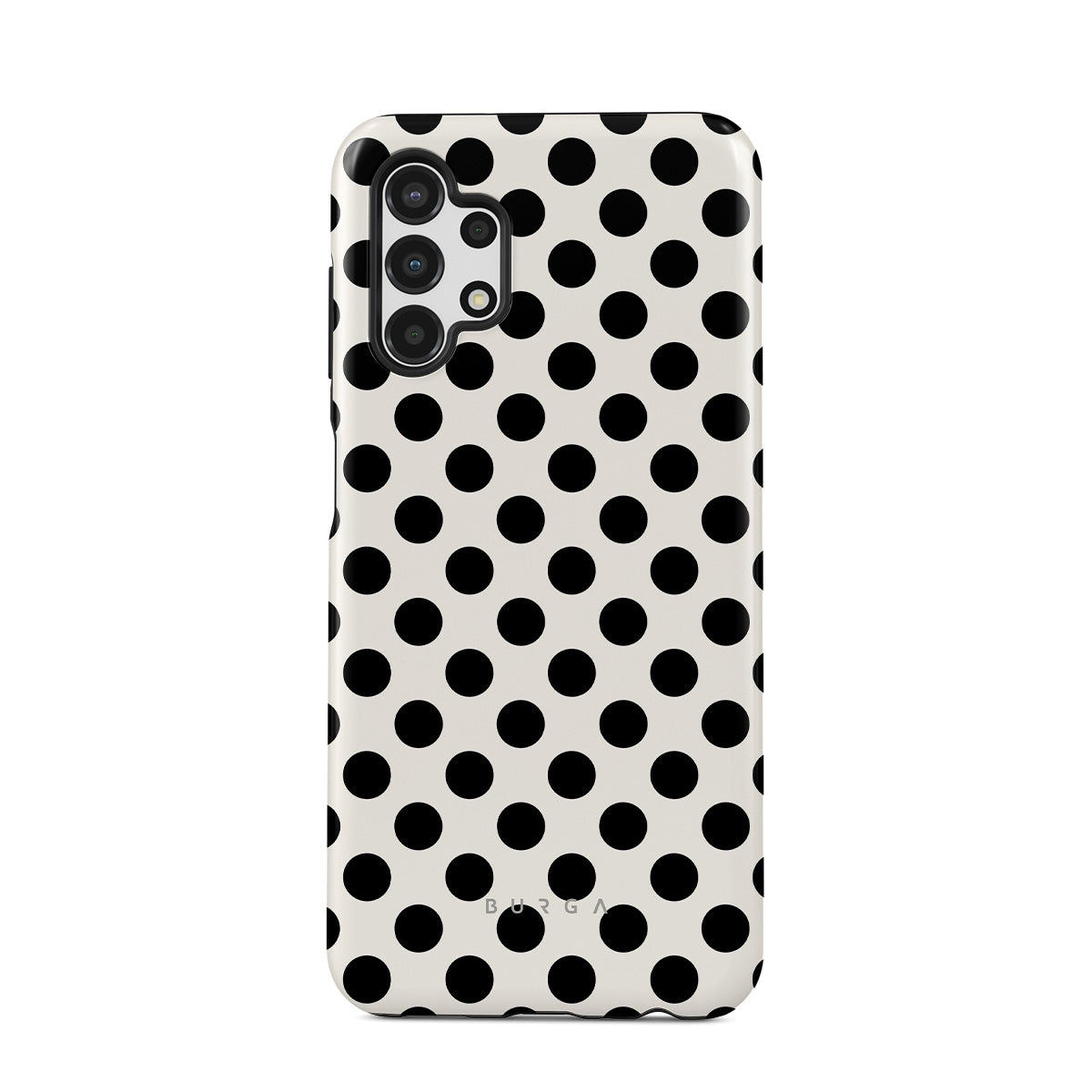 このデザインの特徴:白い背景に黒い水玉模様が施されています。