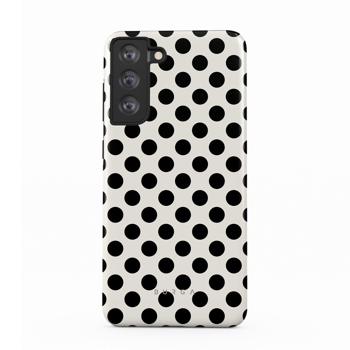 このデザインの特徴:白い背景に黒い水玉模様が施されています。