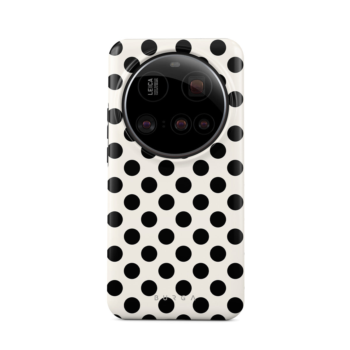 このデザインの特徴:白い背景に黒い水玉模様が施されています。