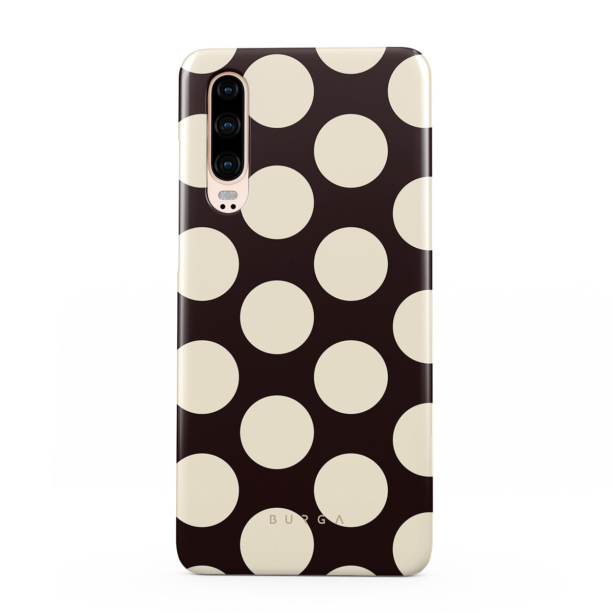 このデザインの特徴:ダークな背景に大きなクリーム色の水玉模様が特徴です。
