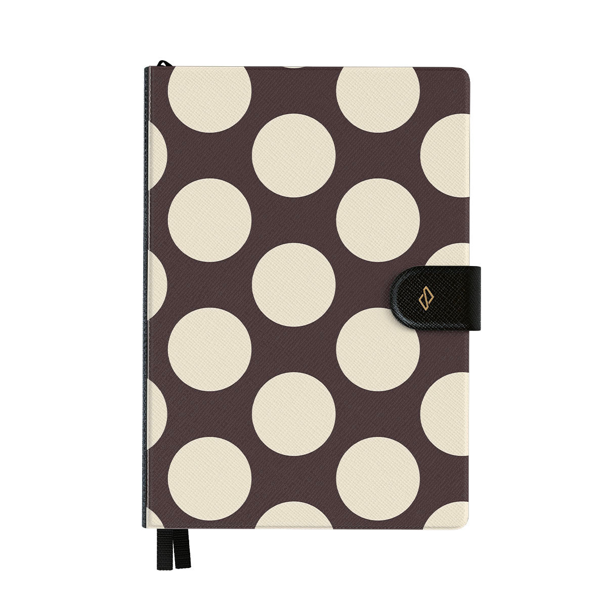 このデザインの特徴:ダークな背景に大きなクリーム色の水玉模様が特徴です。