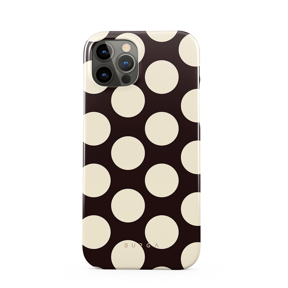 このデザインの特徴:ダークな背景に大きなクリーム色の水玉模様が特徴です。