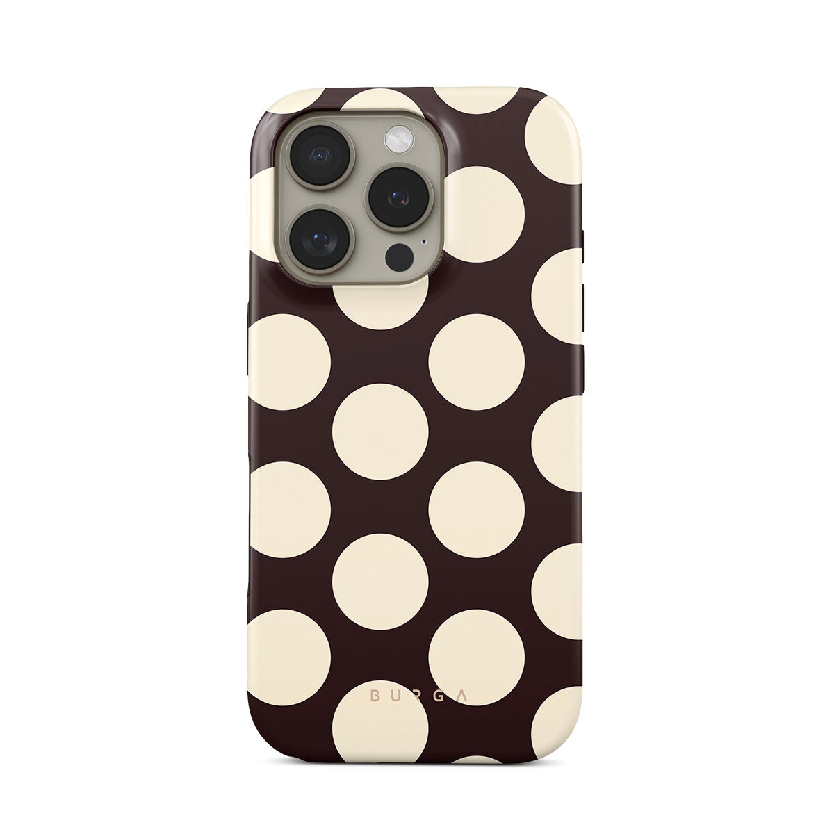 このデザインの特徴:ダークな背景に大きなクリーム色の水玉模様が特徴です。