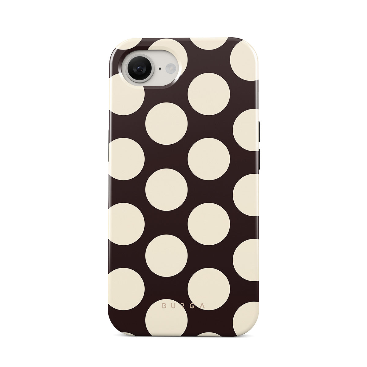 このデザインの特徴:ダークな背景に大きなクリーム色の水玉模様が特徴です。