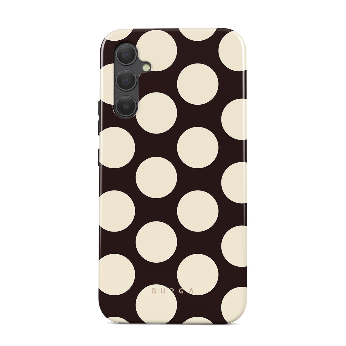 このデザインの特徴:ダークな背景に大きなクリーム色の水玉模様が特徴です。