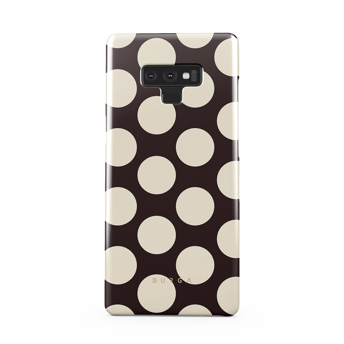 このデザインの特徴:ダークな背景に大きなクリーム色の水玉模様が特徴です。