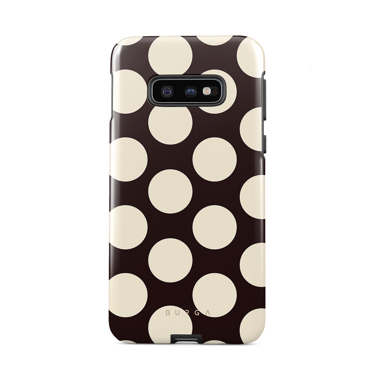 このデザインの特徴:ダークな背景に大きなクリーム色の水玉模様が特徴です。
