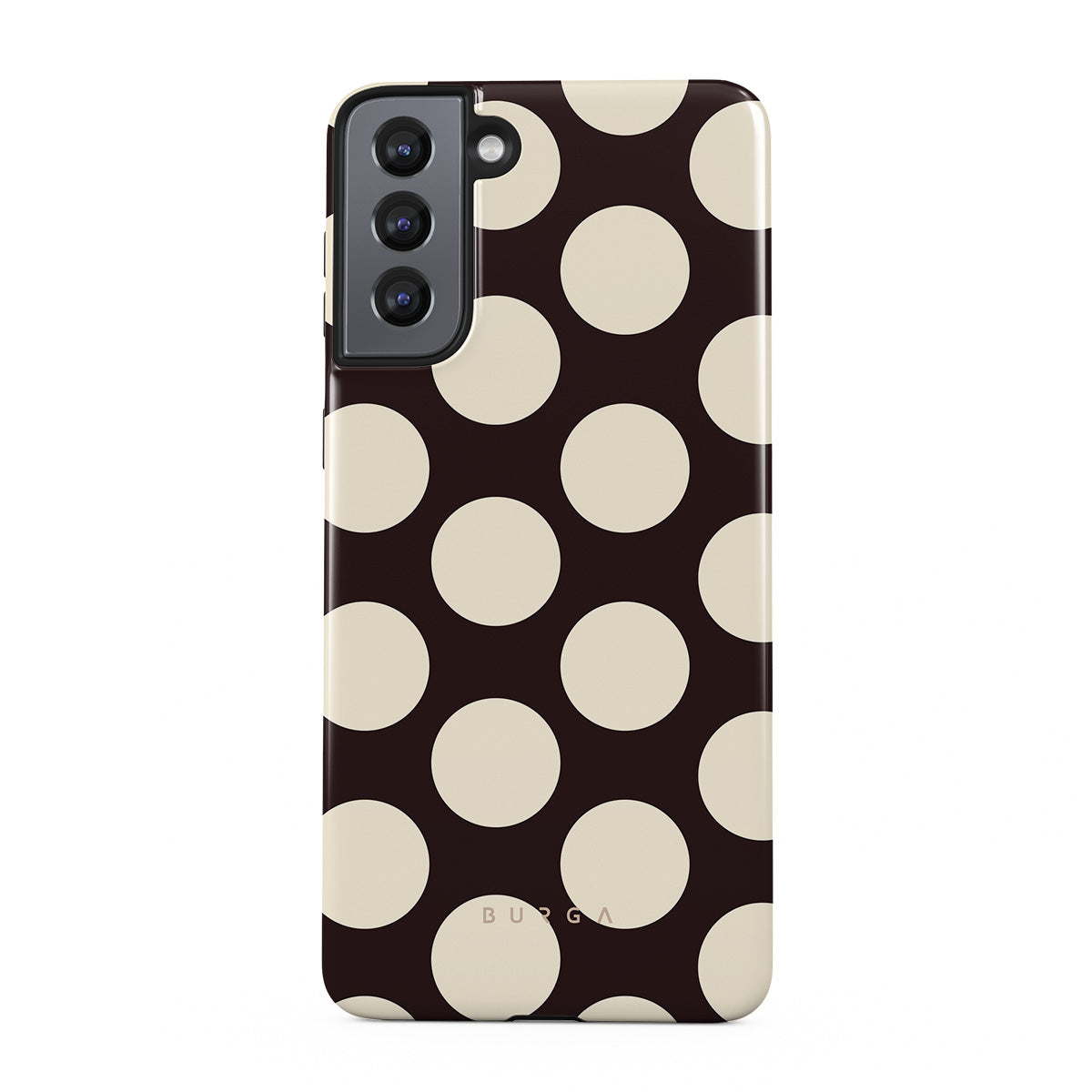 このデザインの特徴:ダークな背景に大きなクリーム色の水玉模様が特徴です。