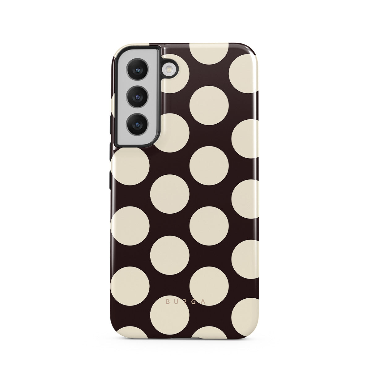 このデザインの特徴:ダークな背景に大きなクリーム色の水玉模様が特徴です。
