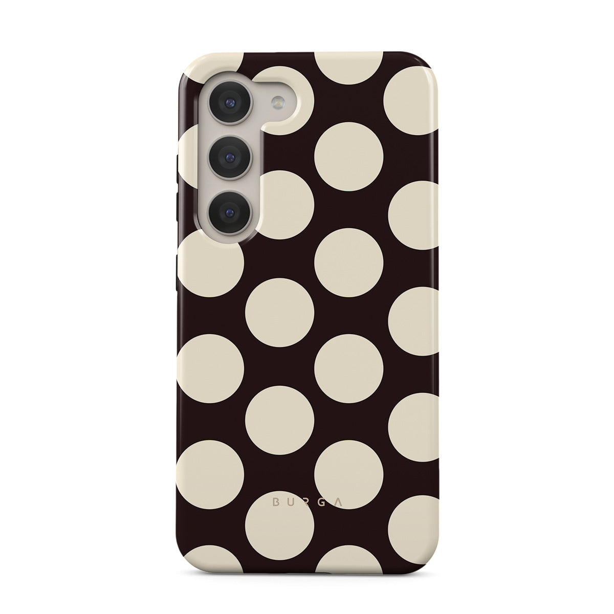 このデザインの特徴:ダークな背景に大きなクリーム色の水玉模様が特徴です。