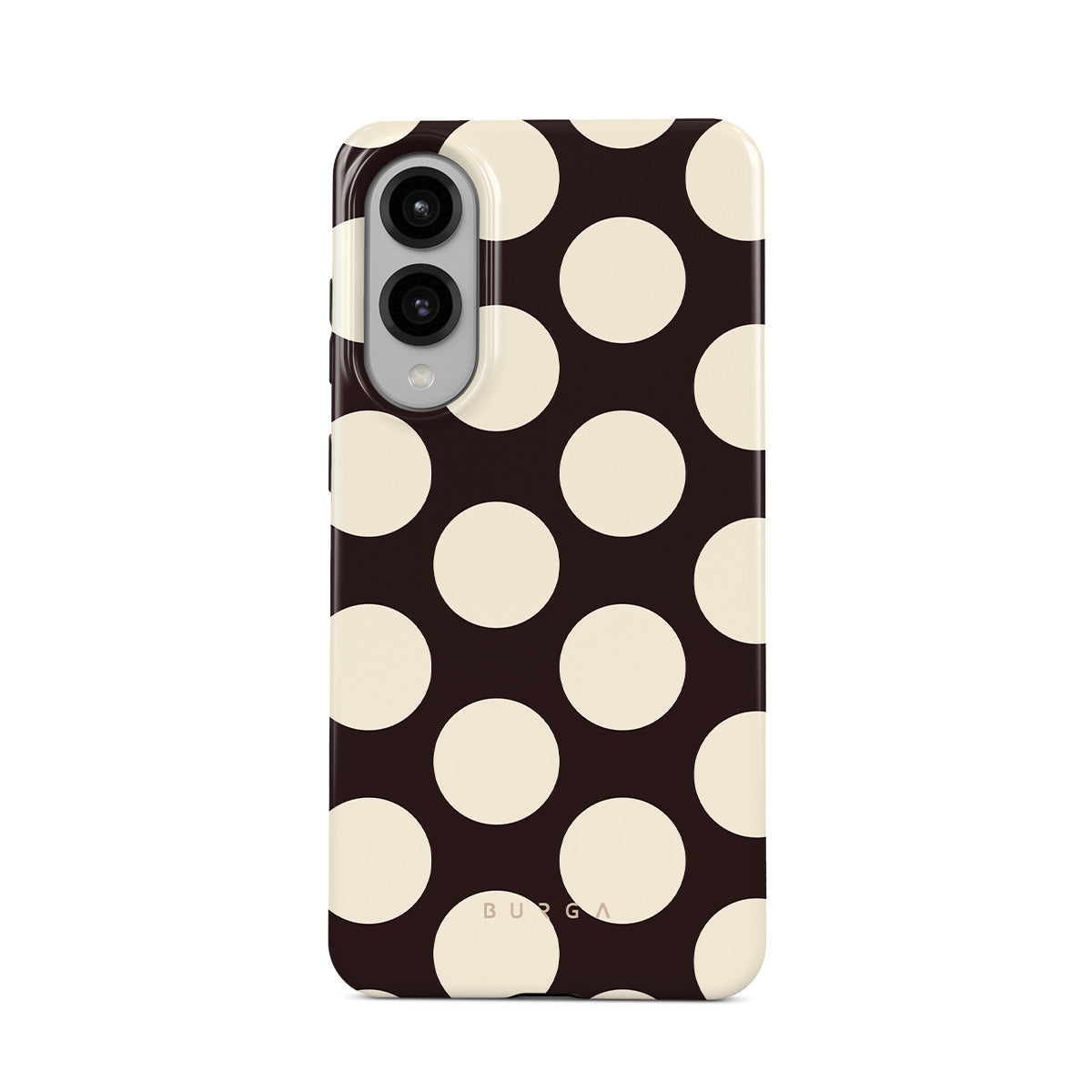 このデザインの特徴:ダークな背景に大きなクリーム色の水玉模様が特徴です。