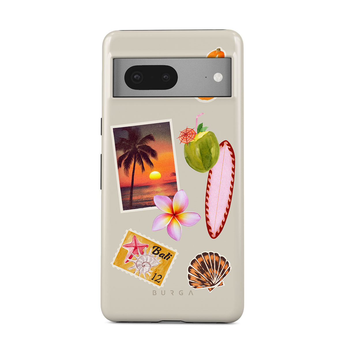 このデザインの特徴:、トロピカルな夕焼けの写真、パパイヤ、青いココナッツ、ピンクのサーフボード、ピンクのプルメリアの花、オレンジ色の貝殻、バリ島のポストカードが含まれています。