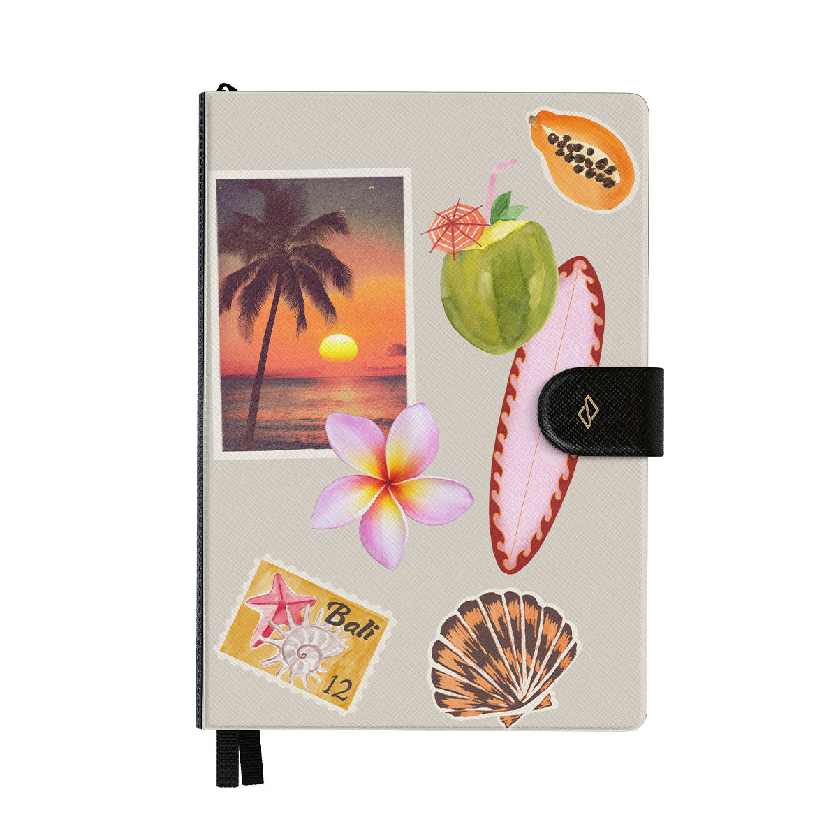 このデザインの特徴:、トロピカルな夕焼けの写真、パパイヤ、青いココナッツ、ピンクのサーフボード、ピンクのプルメリアの花、オレンジ色の貝殻、バリ島のポストカードが含まれています。