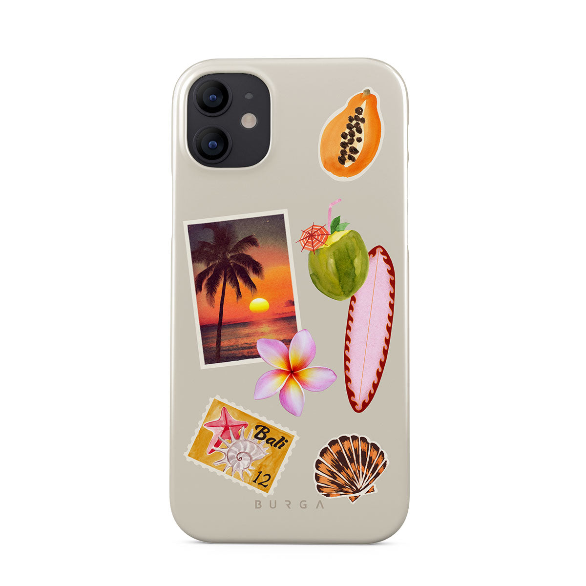 このデザインの特徴:、トロピカルな夕焼けの写真、パパイヤ、青いココナッツ、ピンクのサーフボード、ピンクのプルメリアの花、オレンジ色の貝殻、バリ島のポストカードが含まれています。
