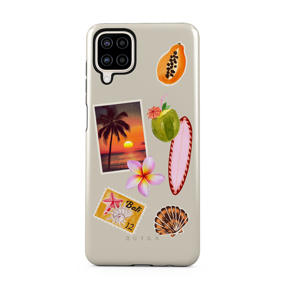 このデザインの特徴:、トロピカルな夕焼けの写真、パパイヤ、青いココナッツ、ピンクのサーフボード、ピンクのプルメリアの花、オレンジ色の貝殻、バリ島のポストカードが含まれています。