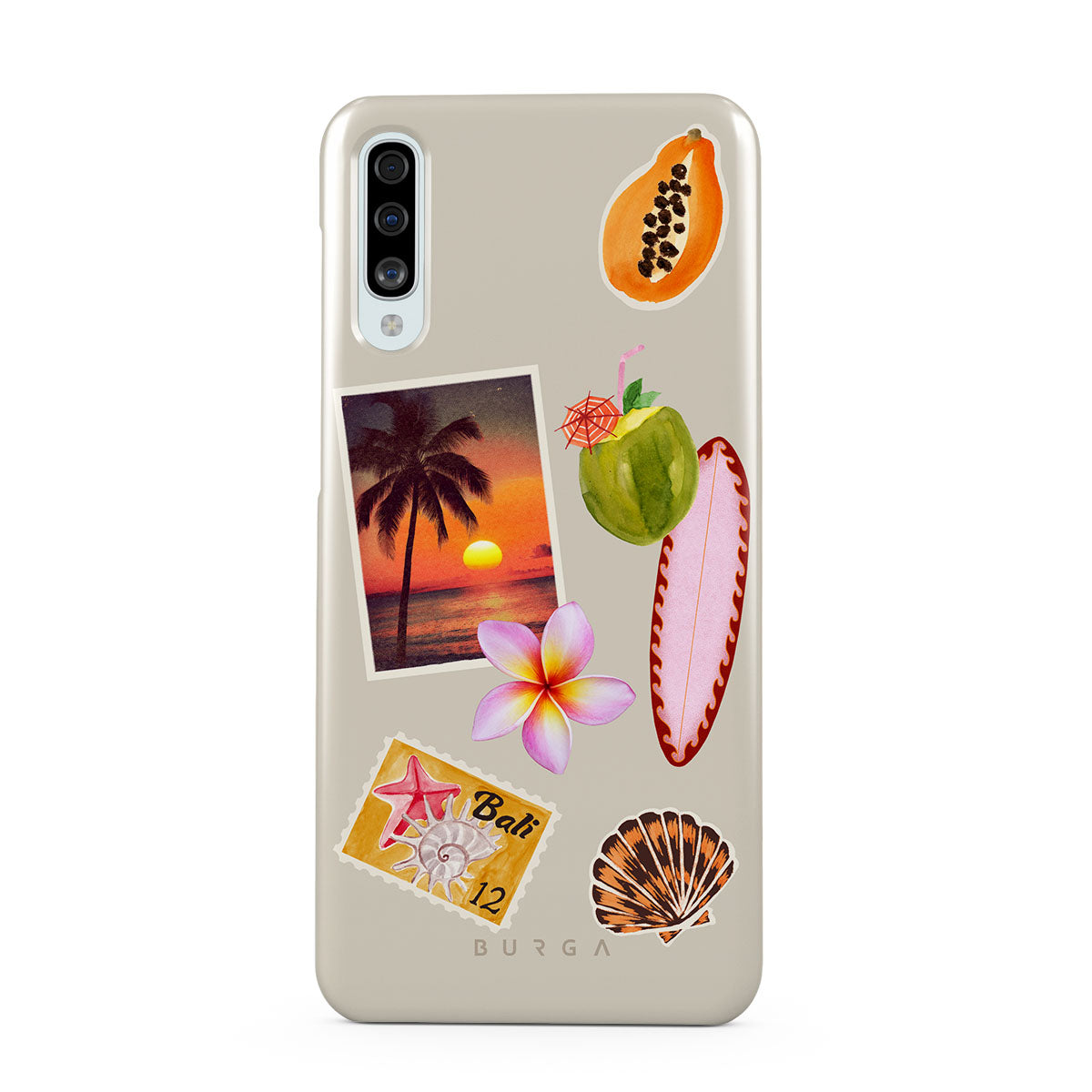 このデザインの特徴:、トロピカルな夕焼けの写真、パパイヤ、青いココナッツ、ピンクのサーフボード、ピンクのプルメリアの花、オレンジ色の貝殻、バリ島のポストカードが含まれています。