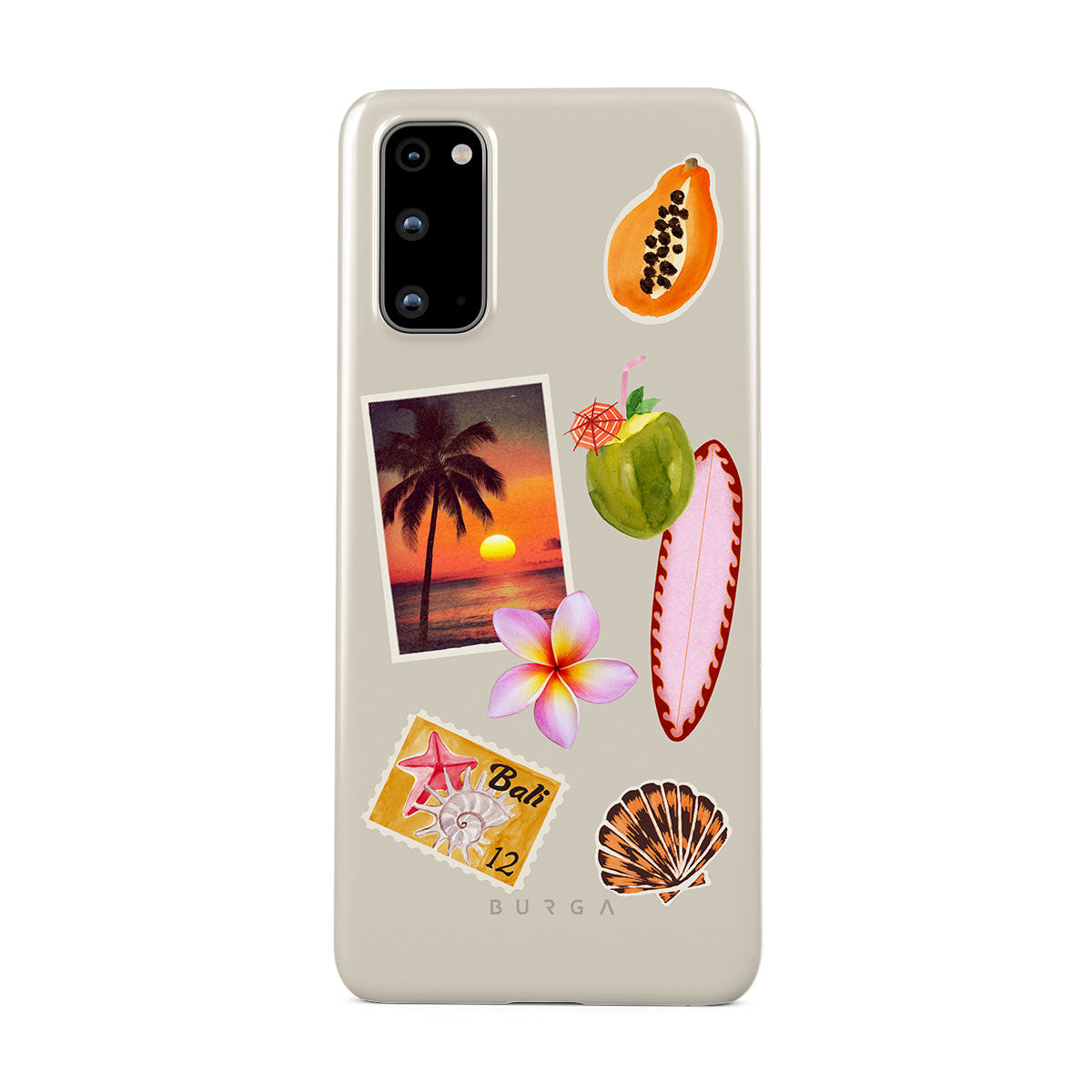 このデザインの特徴:、トロピカルな夕焼けの写真、パパイヤ、青いココナッツ、ピンクのサーフボード、ピンクのプルメリアの花、オレンジ色の貝殻、バリ島のポストカードが含まれています。