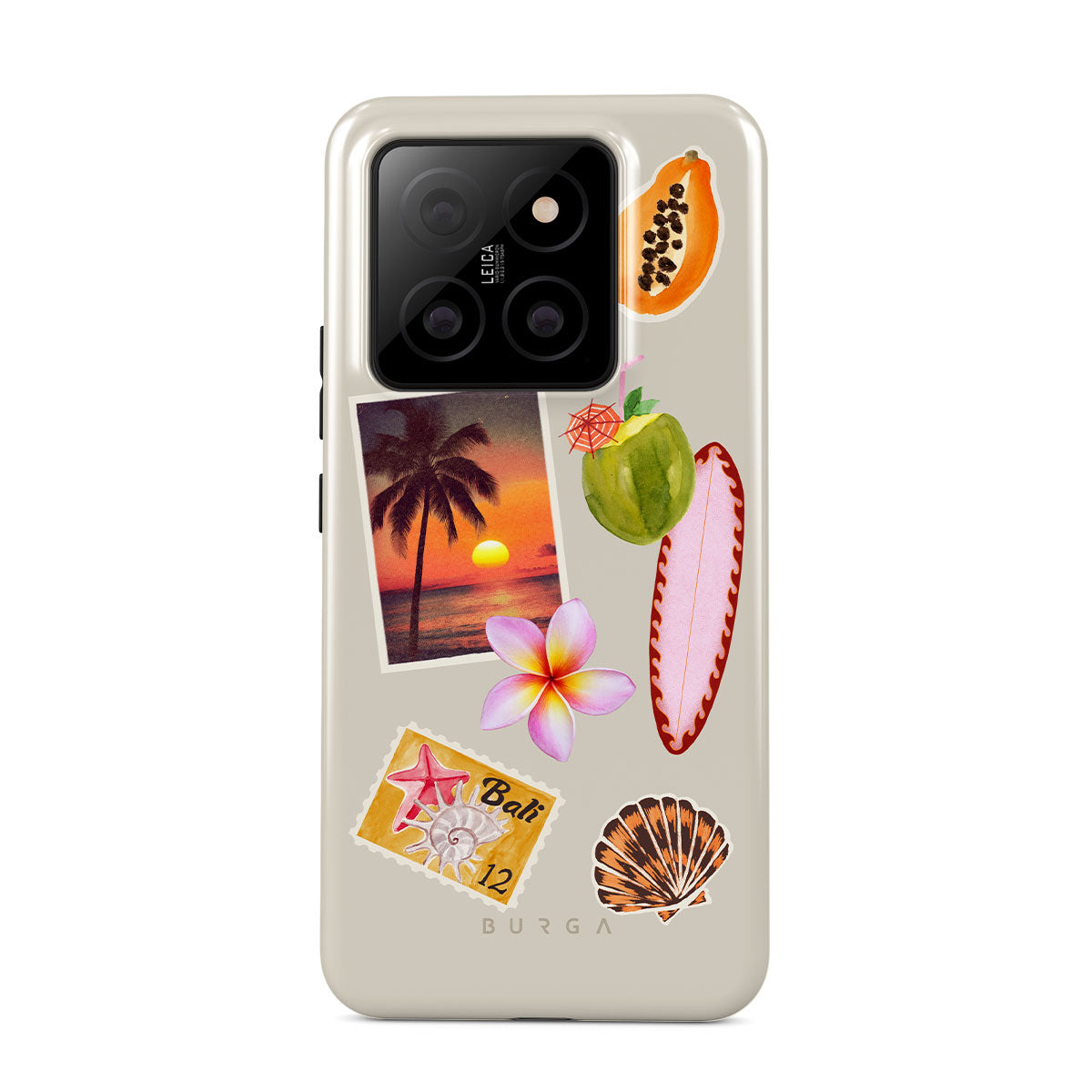このデザインの特徴:、トロピカルな夕焼けの写真、パパイヤ、青いココナッツ、ピンクのサーフボード、ピンクのプルメリアの花、オレンジ色の貝殻、バリ島のポストカードが含まれています。