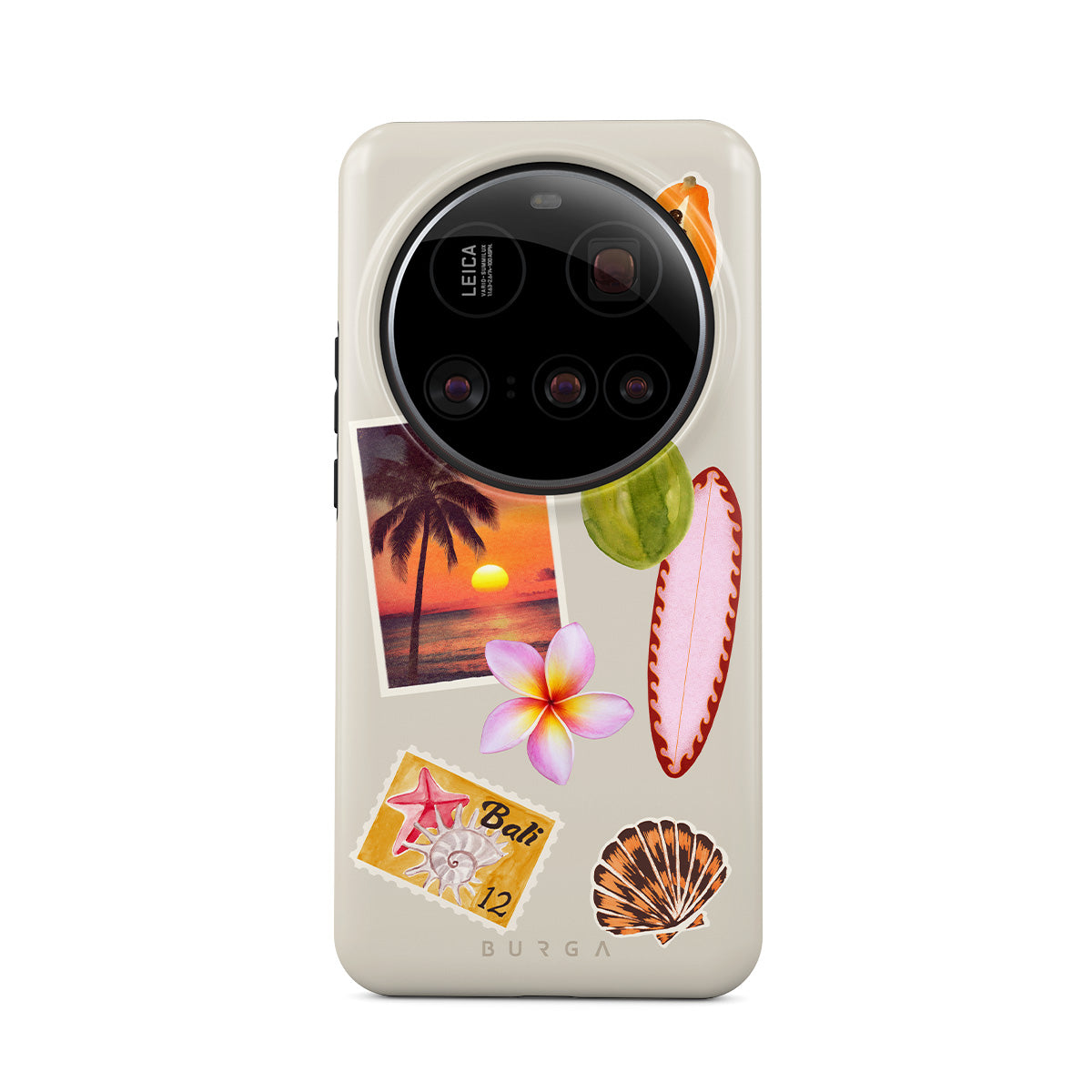 このデザインの特徴:、トロピカルな夕焼けの写真、パパイヤ、青いココナッツ、ピンクのサーフボード、ピンクのプルメリアの花、オレンジ色の貝殻、バリ島のポストカードが含まれています。