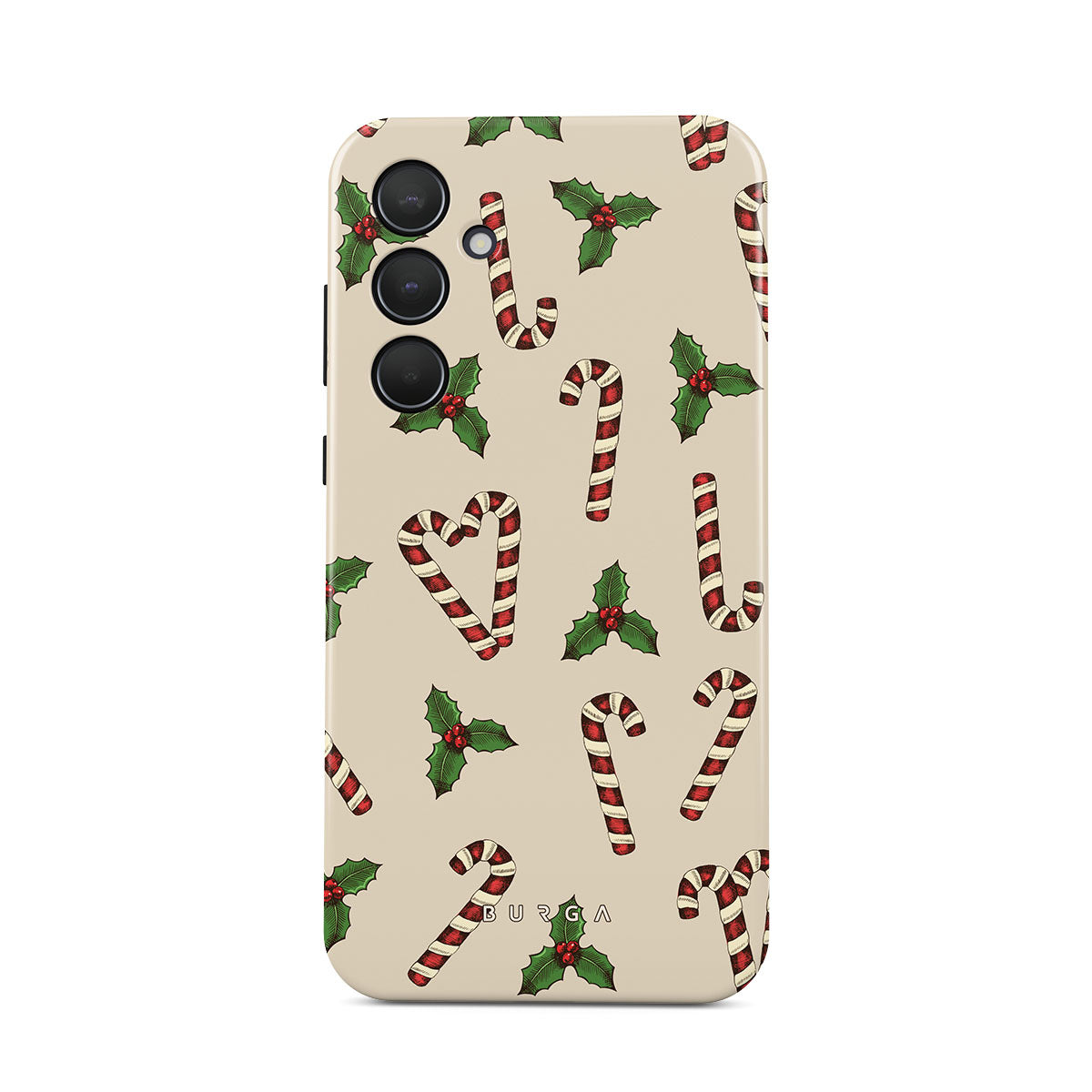 デザインの特徴:クリスマスキャンディ、クリスマスホーリー、グリーン、ホワイト、クリスマス柄