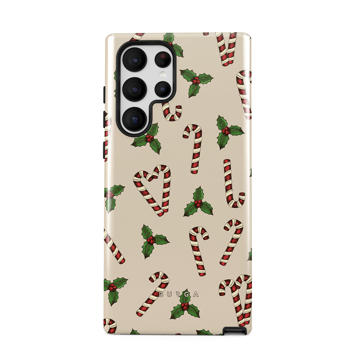 デザインの特徴:クリスマスキャンディ、クリスマスホーリー、グリーン、ホワイト、クリスマス柄