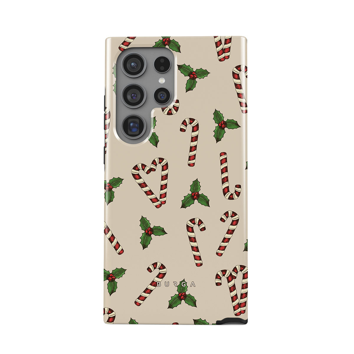 デザインの特徴:クリスマスキャンディ、クリスマスホーリー、グリーン、ホワイト、クリスマス柄