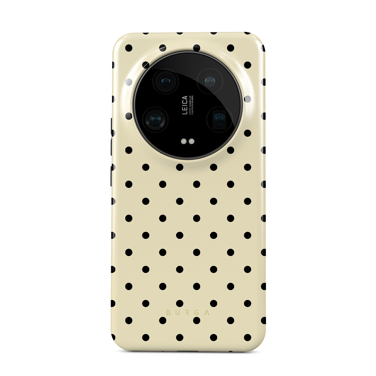 このデザインの特徴:黒の小さな水玉模様が入ったベージュの背景が特徴です。