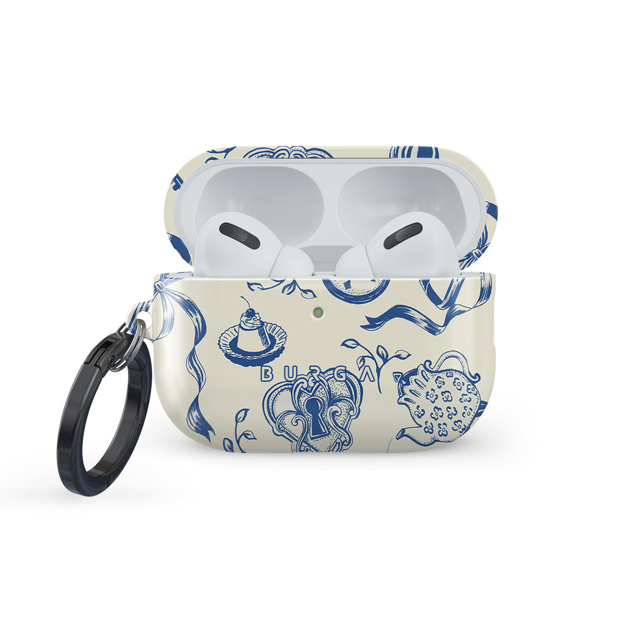 このデザインの特徴ティーカップ、ティーポット、懐中時計、鍵、ハート、陶器、青と白の模様