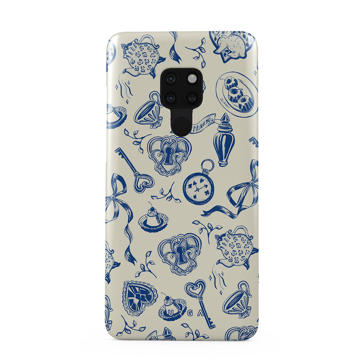 このデザインの特徴ティーカップ、ティーポット、懐中時計、鍵、ハート、陶器、青と白の模様
