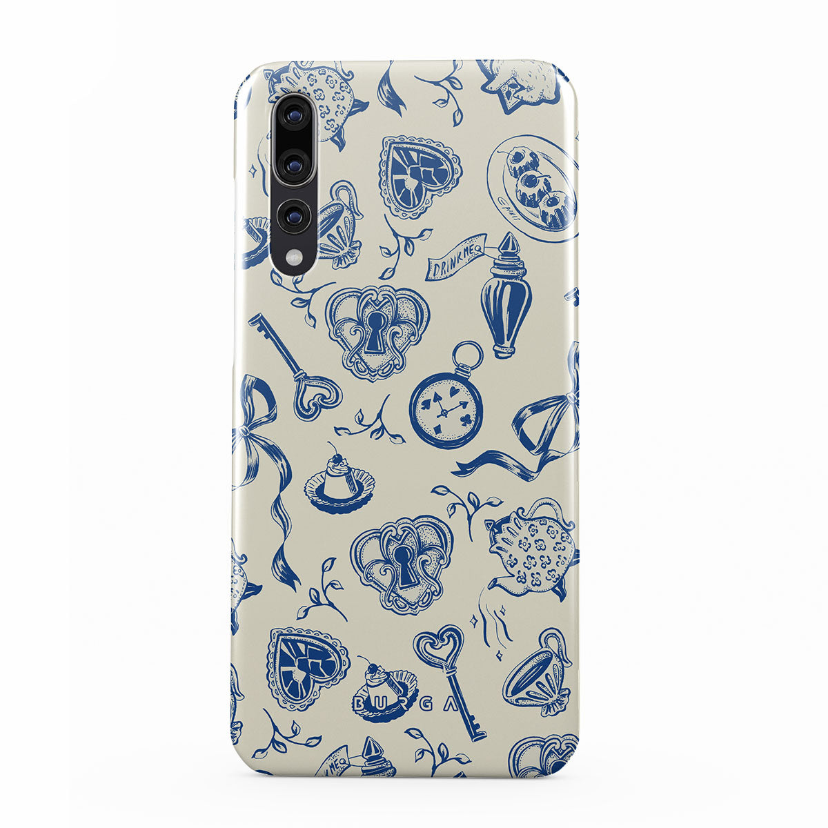 このデザインの特徴ティーカップ、ティーポット、懐中時計、鍵、ハート、陶器、青と白の模様