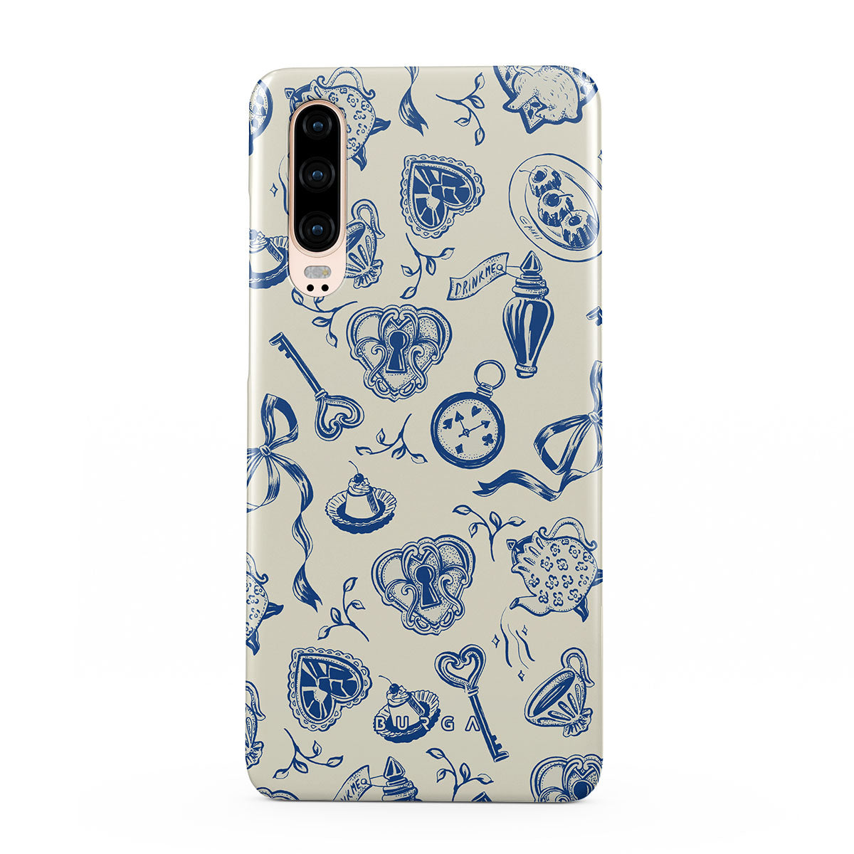 このデザインの特徴ティーカップ、ティーポット、懐中時計、鍵、ハート、陶器、青と白の模様