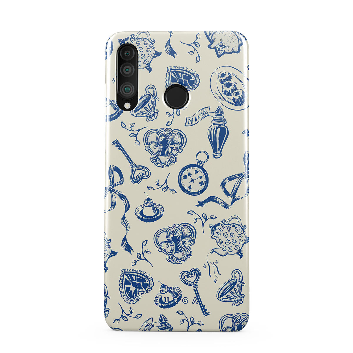 このデザインの特徴ティーカップ、ティーポット、懐中時計、鍵、ハート、陶器、青と白の模様