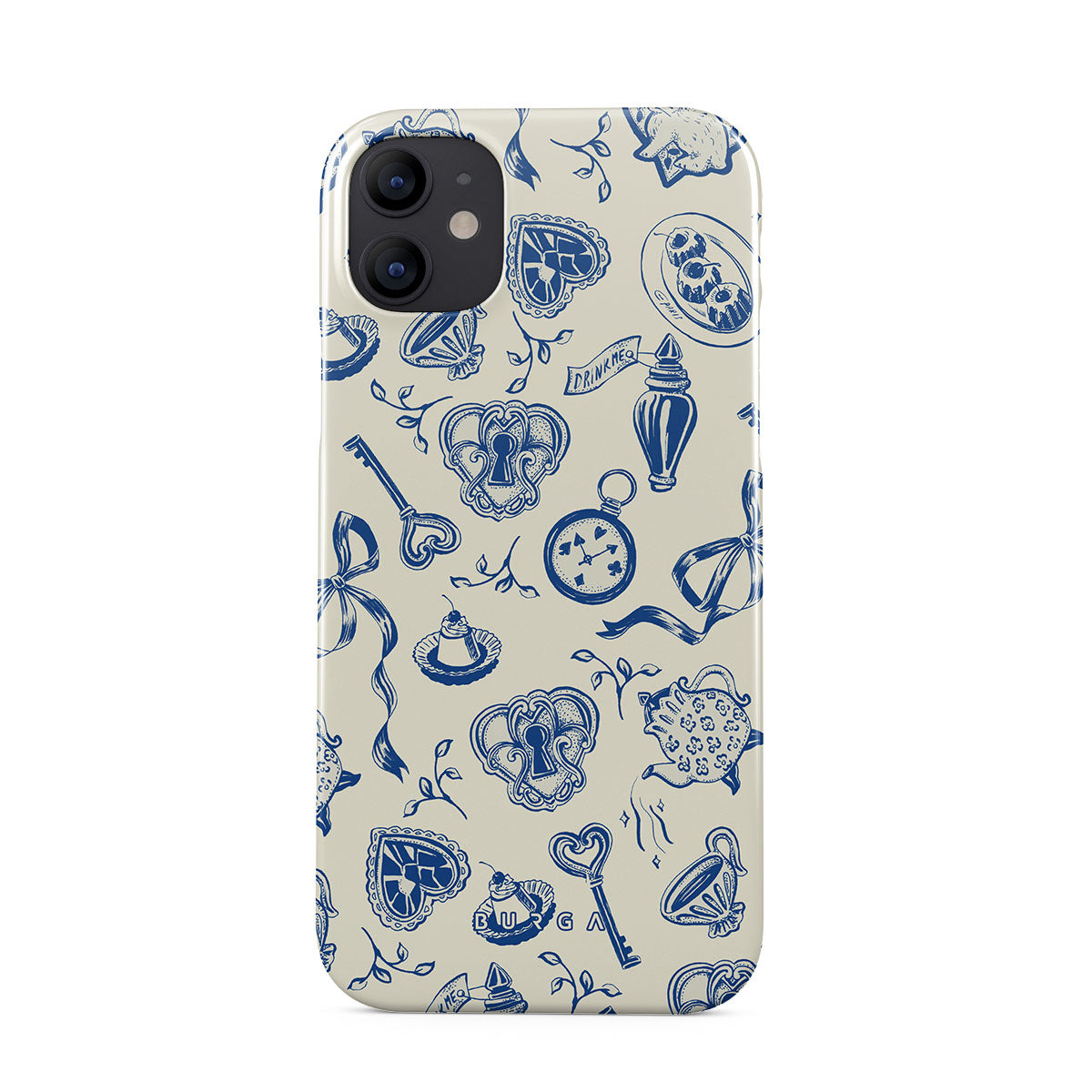 このデザインの特徴ティーカップ、ティーポット、懐中時計、鍵、ハート、陶器、青と白の模様
