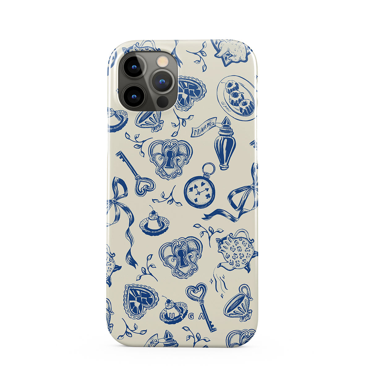 このデザインの特徴ティーカップ、ティーポット、懐中時計、鍵、ハート、陶器、青と白の模様